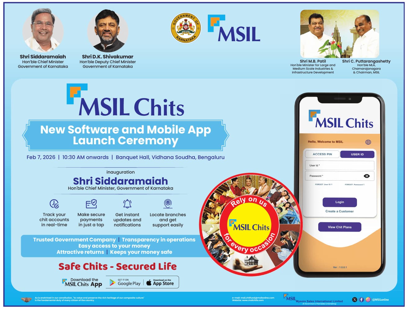 As a Government Company with more than 54 years of existence, MSIL has a reputation in the market for stability, reliability and integrity. Trustworthiness, transparency in operation, past proven performance and familiarity are important prerequisites of a Chit Fund operator. MSIL has all these credentials, being a Govt. Company.